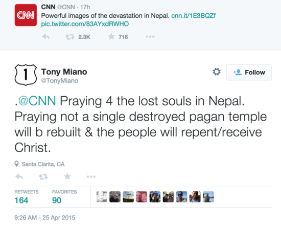 That’s right. God only allowed these terrible things to happen so that more people – excluding the ones he murdered, obviously – would have the chance to turn to Christ. Isn’t that marvellous? And Tony Miano, who is the same lunatic street preacher arrested in London in 2013 for sharing God’s ‘love’ for LGBT people, is not alone. German pastor Wolfgang Wegert said much the same thing of those who died on Germanwings Flight 9525: ‘A plane crash is a reminder of our own mortality. By that, God wants to make people repent, so that we (can) be saved by Jesus.’