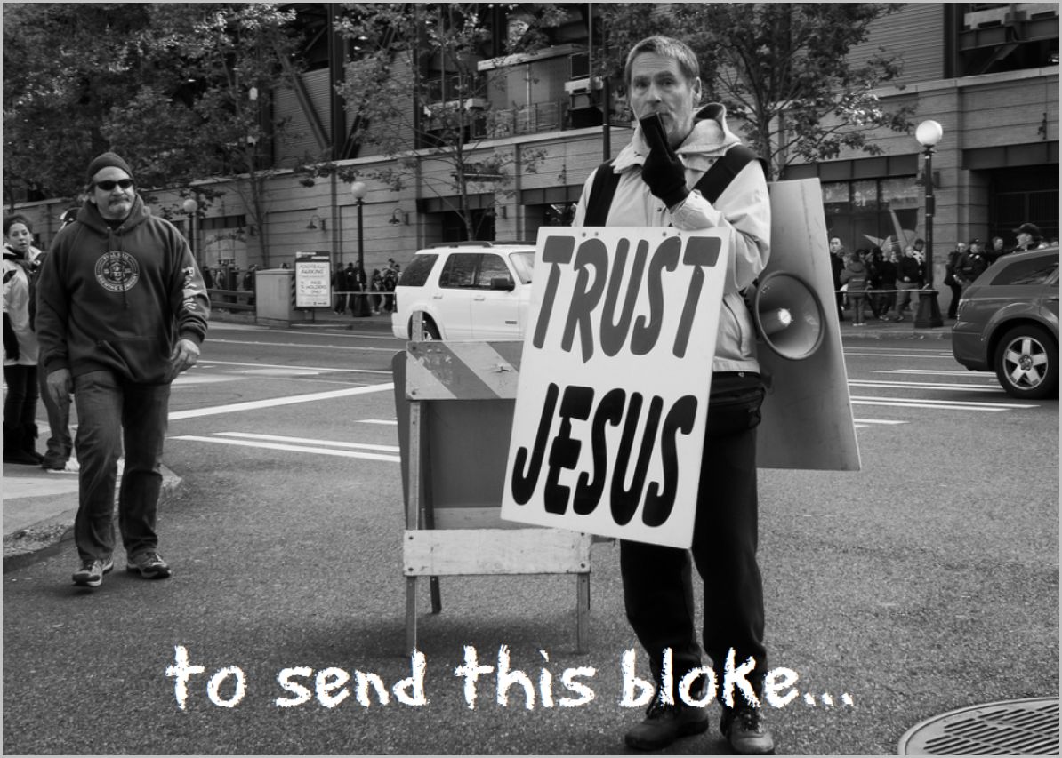 ‘Jesus!’ I mutter under my breath. ‘Look, I don’t believe in your Christ or any of this stuff.” I push his tract back at him, ‘and I’m not your friend either.’ He looks crestfallen, but only for the briefest of seconds. His ally, still performing for the crowd, is shouting that Jesus is coming back soon to judge the world.