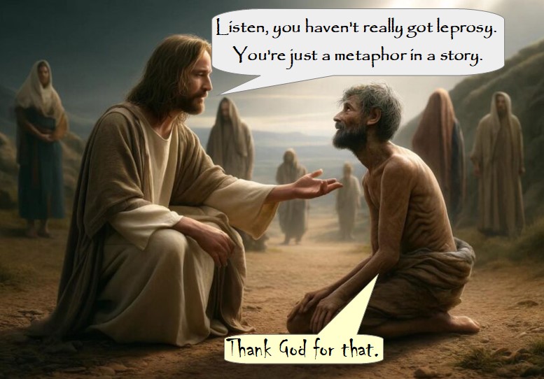 So there you have it. The leper is a metaphor for the sinner in need of the heavenly Jesus’ cleansing. His leprosy is a metaphor for the sin itself. The healing is a metaphor for the penitent’s spiritual purification. The man’s by-passing of the Jewish law is a metaphor for Jesus replacing the law. The cleansed leper’s shouting about it is a metaphor for the early cult’s desire to keep its rituals and teaching secret. Its parables like this one were designed to enlighten cult members while obfuscating and confusing the unbeliever (Mark 4:11-12).